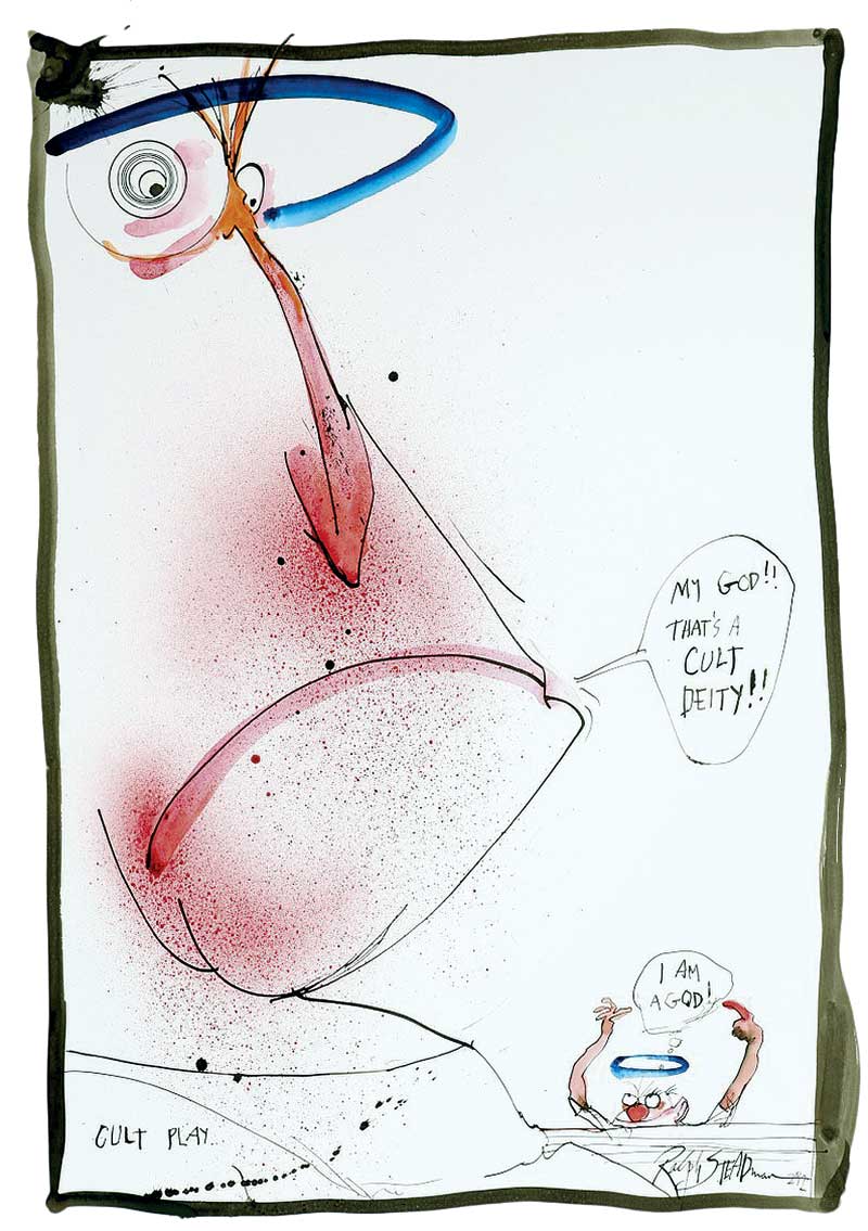 Are there any living beings worthy of deification? Our priests are paedophiles, our politicians are celebrities, our celebrities are earthworms. I have previously suggested (in a book) that this spiritual vacuum might be filled with the worship of a writer, Will Self. But, for all his colourful wordplay, I’m thinking if it’s based on words alone it may be too drab, too Reformation. Our cult needs the gaudiness of Rome. Where better to look than to a cartoonist?
