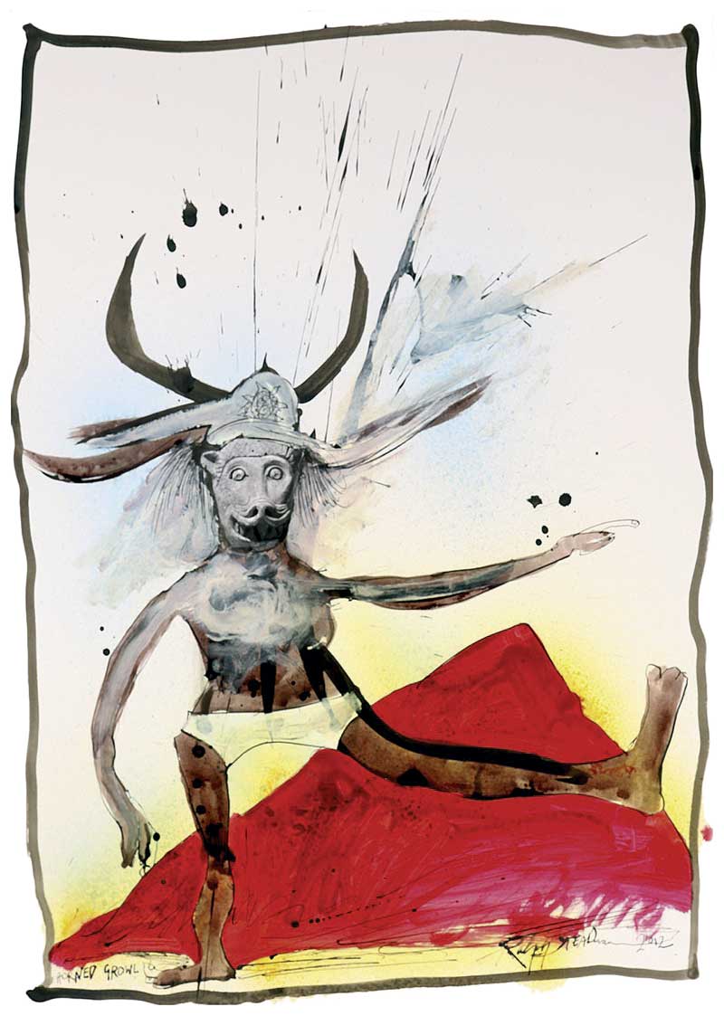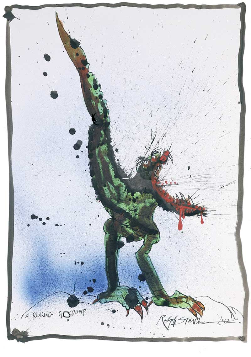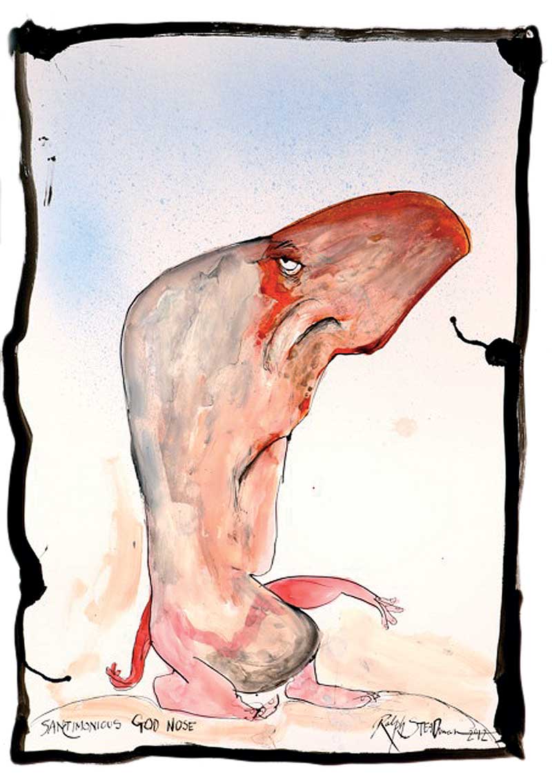 The cartoonists deserve a cult of their own. One might term this a man-made polytheistic religion, with a number of different deities wielding pen, paint and ink. Martin Rowson, of this parish, will be our god of war, for he compares cartooning to voodoo – doing damage from a distance with a sharp instrument. Gerald Scarfe will serve as god of Politics, and dear old Quintin Blake the god of Love. But above all, foremost in the hierarchy, will be Ralph Steadman. Steadman, who riffed with the deranged demigod Hunter S Thompson, takes to himself the power to strip petty humans to their miserable core; he speaks of his visual satire in visceral terms – describing how his cartoons “unmask a face” and “get down to skin and bone”. And we are living in an era when masks are indeed being torn off – torn from the faces of bankers and politicians. Cartoonists, arguably, produce more powerful satire than journalists – they skewer these bastards with their pencils and lay bare their sinew, their corrupted blood and guts.