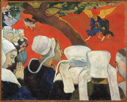 Beyond the church walls, we can notice a similar receptivity to religion in some of the foundational images of modern art. Before he sailed for Tahiti, for instance, Paul Gauguin modelled the figures in “The Vision After the Sermon (Jacob Wrestling with the Angel)” (1888) after the devout peasants he encountered in Brittany. As he wrote to Vincent van Gogh, he even hoped to give the work to a church in Pont-Aven, though “naturally”, Gauguin sniffed, they balked at the offer.