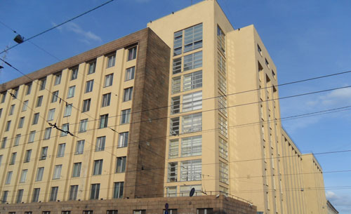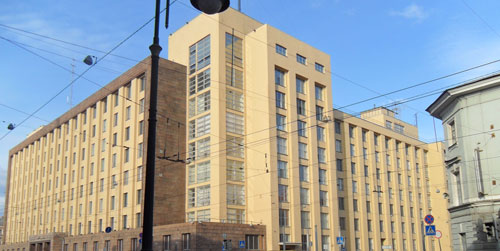 But like the writers who began as idealistic young communists and found themselves writing paeans to slave labour, the architects of Narvskaya Zastava would soon be serving less humane functions. A few miles away from this working-class suburb, in the city centre, is the “Bolshoy Dom” or Big House, designed by Trotsky and Gegello for the NKVD, later the KGB, and still used by the FSB. Here, their modernist lines become rigid and imposing, and the use of glass is opaque rather than transparent in its effects. The building lords it over a stretch of central St Petersburg, looking more than anything else built in this era like a stereotypical Soviet building – domineering, “totalitarian” – and Constructivist architecture in the city ends here.