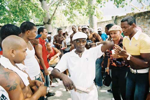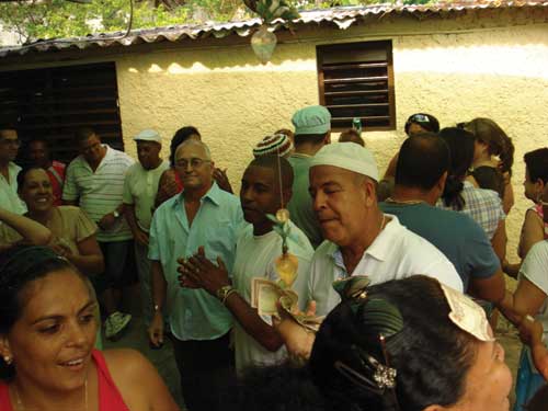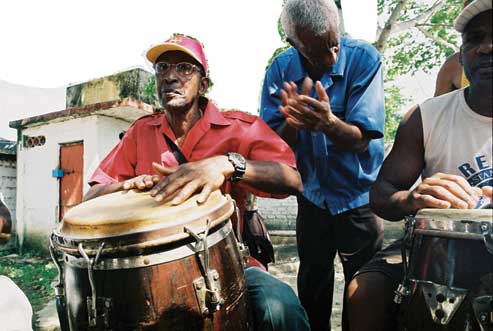 It was around 7pm. A regular house on a regular street in Los Pocitos, an outlying suburb of Havana. There was a short lull in the proceedings. The ceremony had been going for a couple of hours now and everyone crammed into the small space was starting to feel the heat. Some of the better prepared elegant young women snapped open fans while the men sought relief with a slug of rum. Several people milled around outside talking and drinking. A bunch of children fought for space to look through the shutterless window to see better what was happening inside. Maestro Bolaños, universally recognised as one of the most knowledgeable drummers in Cuba, nodded approval as I took my turn.