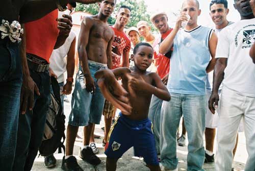 The girls beckoned to us excitedly, “Come! Sit down!” One of them grabbed me, put her arm around me, lowered her eyes and fixed me with the full-force beam of her merciless coquetry. “Oh my god! We’re in trouble! Let’s sit with the tamboreros!” my companion said with a nervous laugh. Some of the drummers knew me and invited us over. Grateful for the rescue, we sat with them and drank beer, trying to ignore the girls playfully beseeching us to join them. The guys, unfazed by the aggressive sexuality of Havana’s jiniteras, paid more attention to comparing their spinning dollar-sign belt-buckles, the latest must-have accessory for the well-dressed young Habanero. Finally Cusito arrived, talking on the phone. He snapped his mobile shut and looked up, “¡Tremenda agua!” he said with a grin.