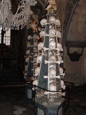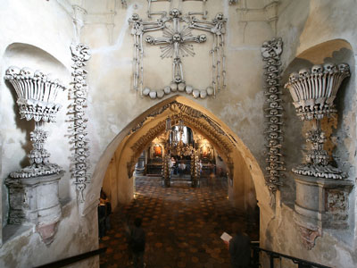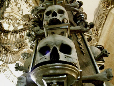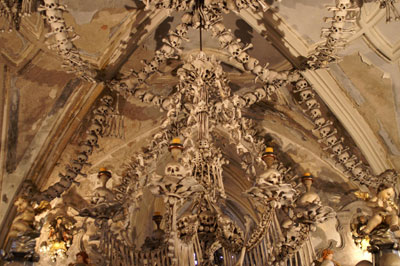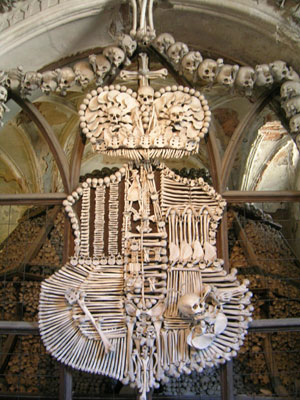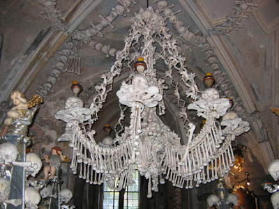 Looking elsewhere in Christian art, one can find even more direct manifestations of this will to appal. Take a look, for example, at Sedlec Ossuary, a small Catholic chapel in the Czech Republic, lying just east of Prague. This outwardly unremarkable little church is lavishly decorated inside with the bones of over 40,000 human bodies amassed since the 12th century. Entering at its main door, one comes face to face with standing plinths bearing skulls resting atop humerus bones. More skulls, hundreds of them, line the stone ribs of the vaulted ceiling and the curves of the arches leading into the alcoves and chancels. Towards the rear, a decorative shield is made up of row upon row of tibias, ulnas, radiuses, metacarpals, mandibles, scapulas, ribs, lumbar vertebrae, manubriums and phalanges. At the top of it, yet more skulls are enframed by white blossoms formed by fanned pelvic girdles. In the center of the nave, an enormous white chandelier looms from the ceiling, made entirely of osseous matter, and including at least one of every bone in the human body.